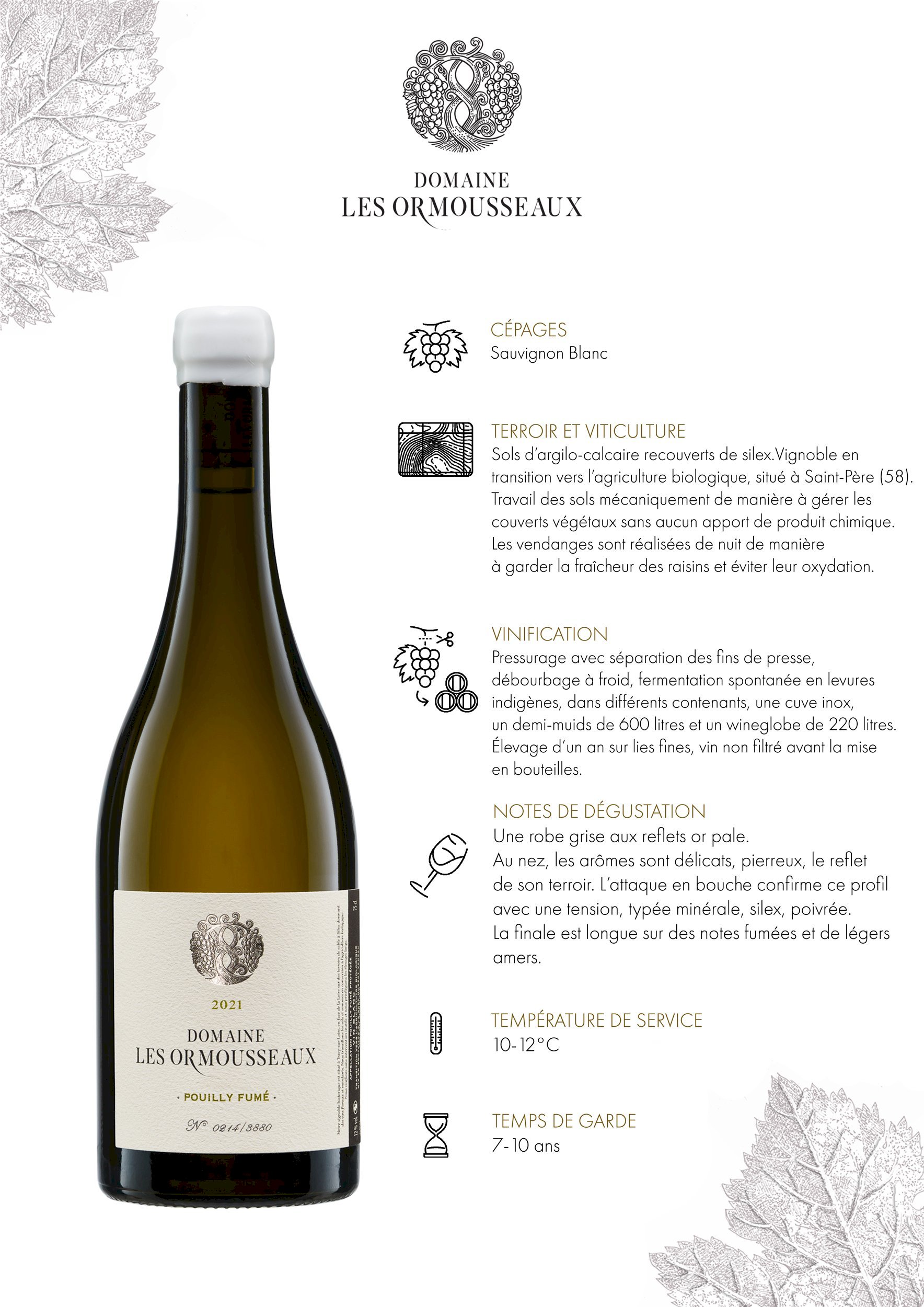 Les arômes délicats de pamplemousse, de fleurs blanches et de silex au nez reflètent son terroir et sa typicité. La bouche confirme son origine avec une minéralité typique, de la tension et une pointe de poivre. La finale est longue et vive, avec une touche de fumé que l'on attend d'un Pouilly Fumé.